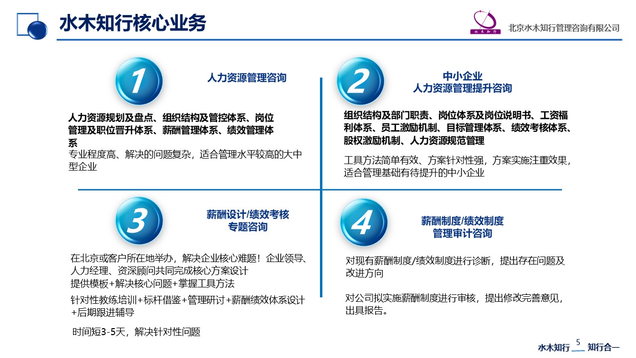 北京水木知行管理咨詢有限公司(www.bjsmzx_com.jhzuche.cn)專注提供人力資源管理咨詢、人力資源管理培訓、人力資源招聘咨詢、人力資源獵頭服務業務;咨詢業務范圍包括組織結構與管控體系、崗位管理體系、薪酬管理體系、績效管理體系,咨詢形式包括全過程咨詢、教練式咨詢和特訓班;培訓業務包括企業基礎管理...[詳情]